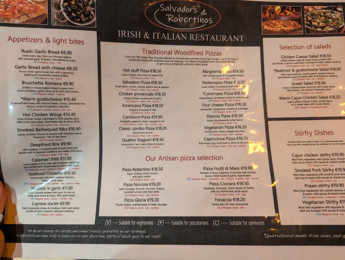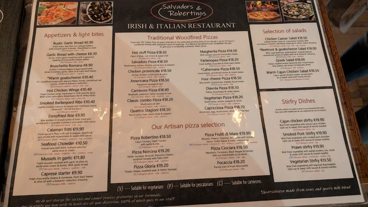 Welcome to Salvadors & Robertinos Killarney, located at 9 High Street in the heart of Killarney, Ireland. This vibrant eatery presents an enticing menu that skillfully merges traditional Italian dishes with local Irish flavors. Whether you're in the mood for a wood-fired pizza or hearty lamb and ribs, each carefully crafted plate promises a delightful culinary experience.